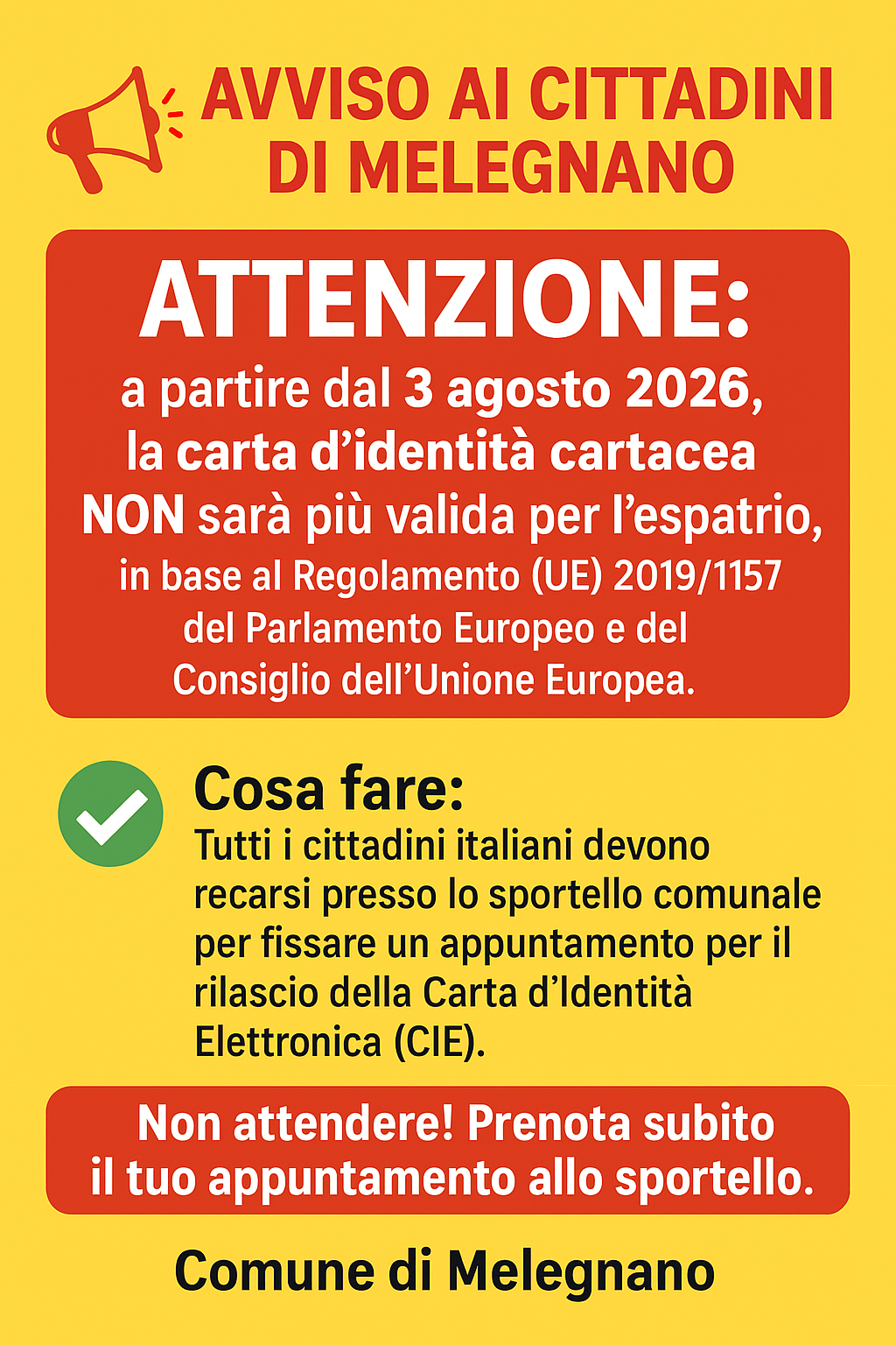 Si invitano i cittadini italiani in possesso della carta d’identità cartacea a controllare la scadenza riportata e a recarsi per tempo presso lo Sportello del Cittadino per fissare un appuntamento per il rilascio della Carta d’Identità Elettronica (CIE).